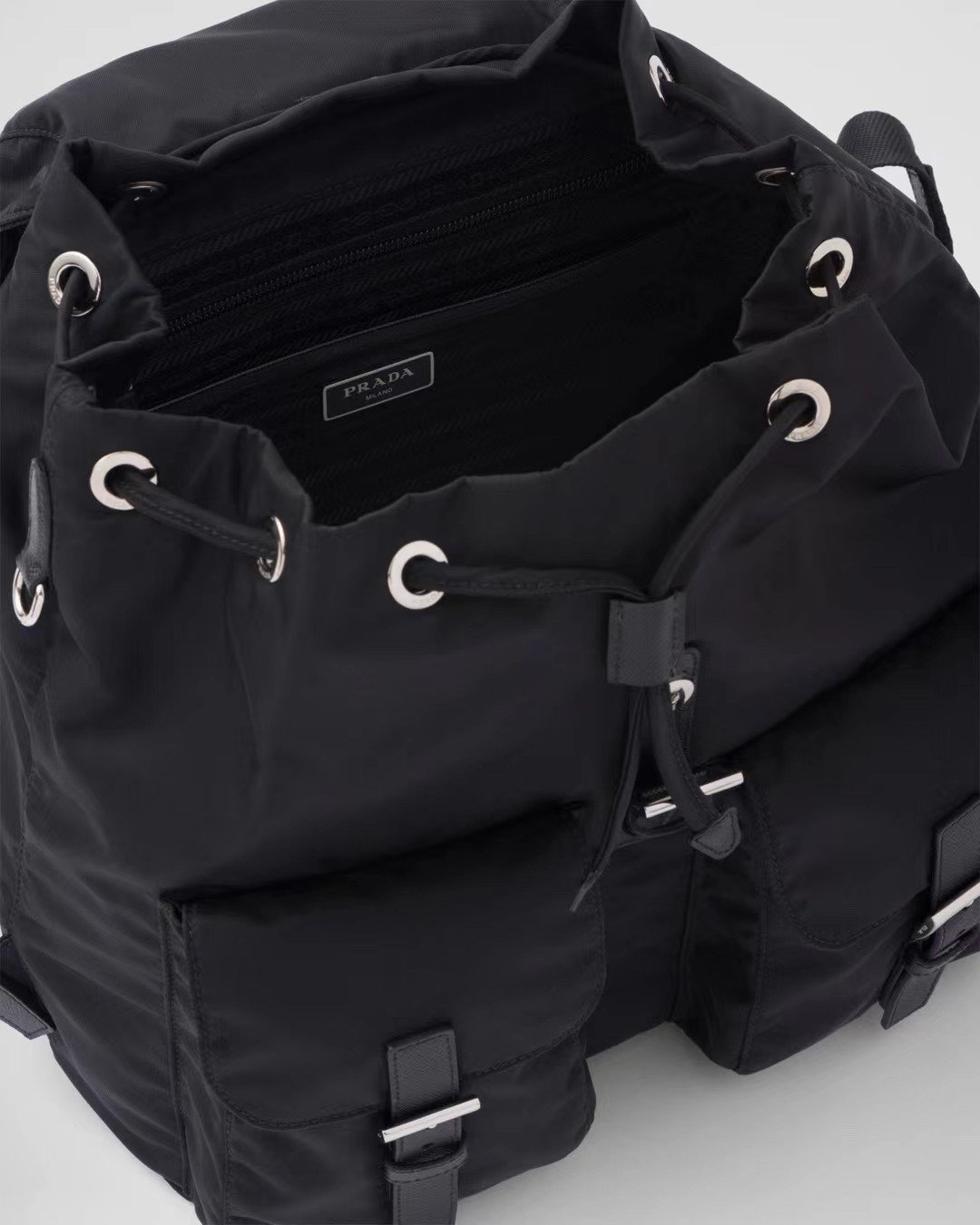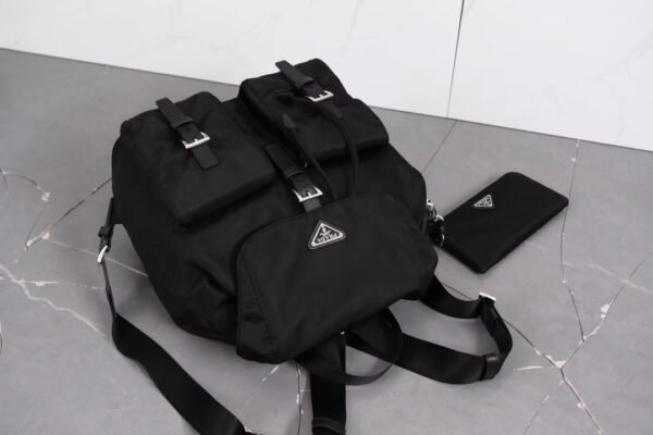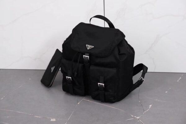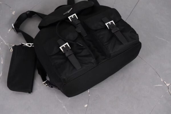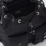 The exterior design is characterized by two prominent front pockets with buckle closures, providing quick access to essentials while maintaining a classic utilitarian look. The iconic enameled metal triangle logo sits proudly on the flap, serving as a hallmark of authentic Milanese craftsmanship. The drawstring closure beneath the flap ensures your belongings remain secure while allowing for flexible storage capacity.