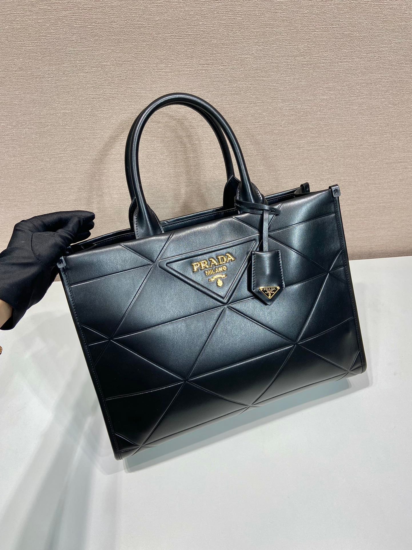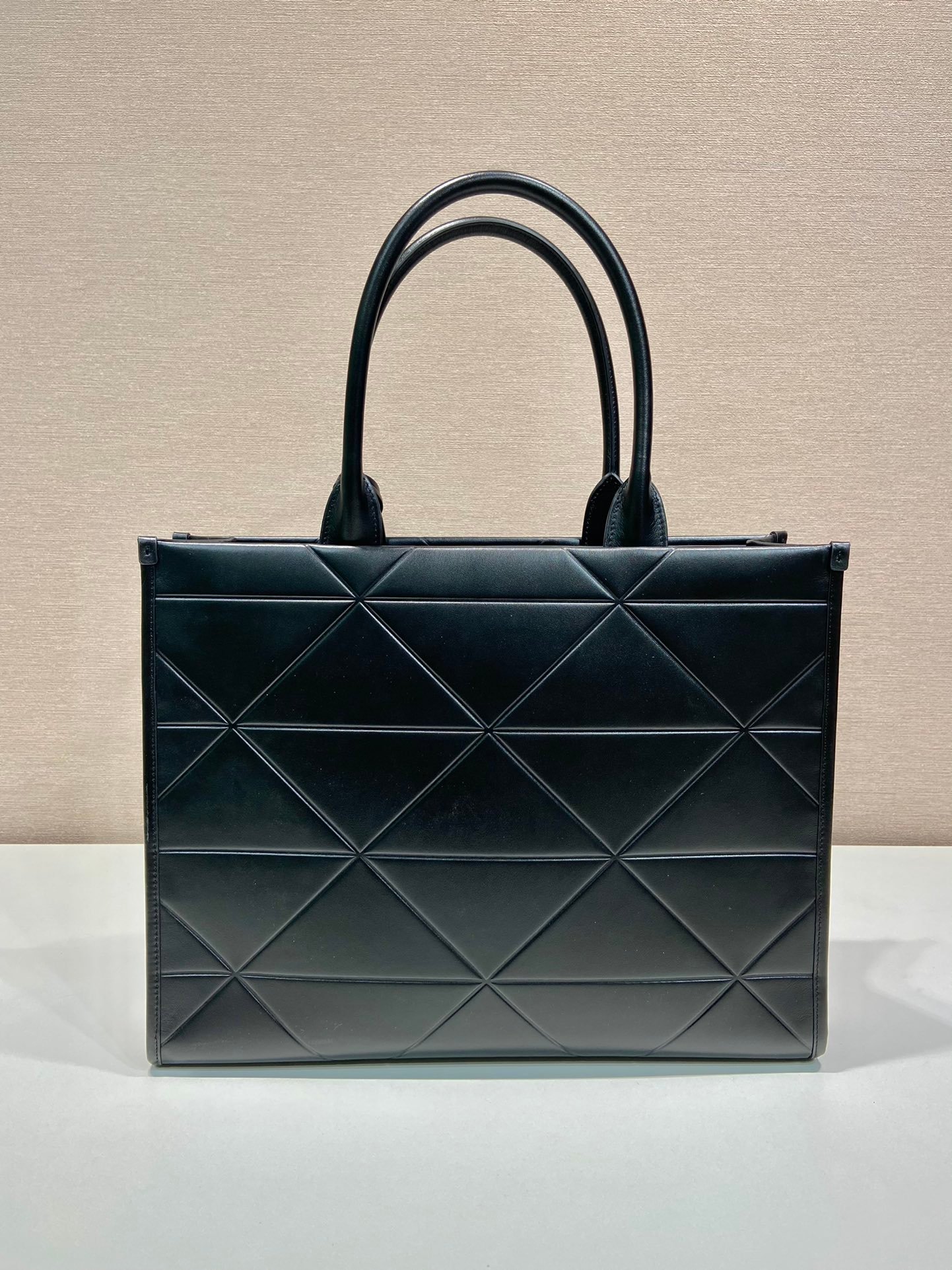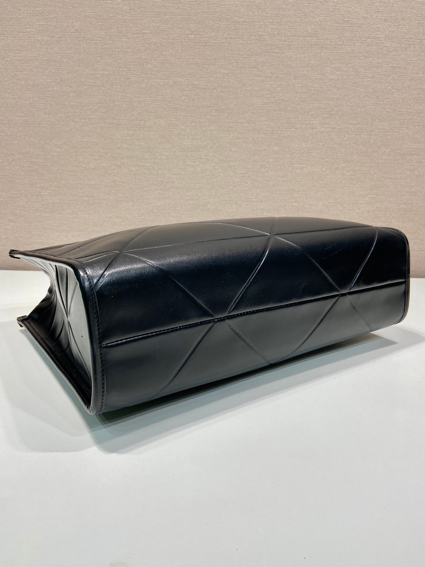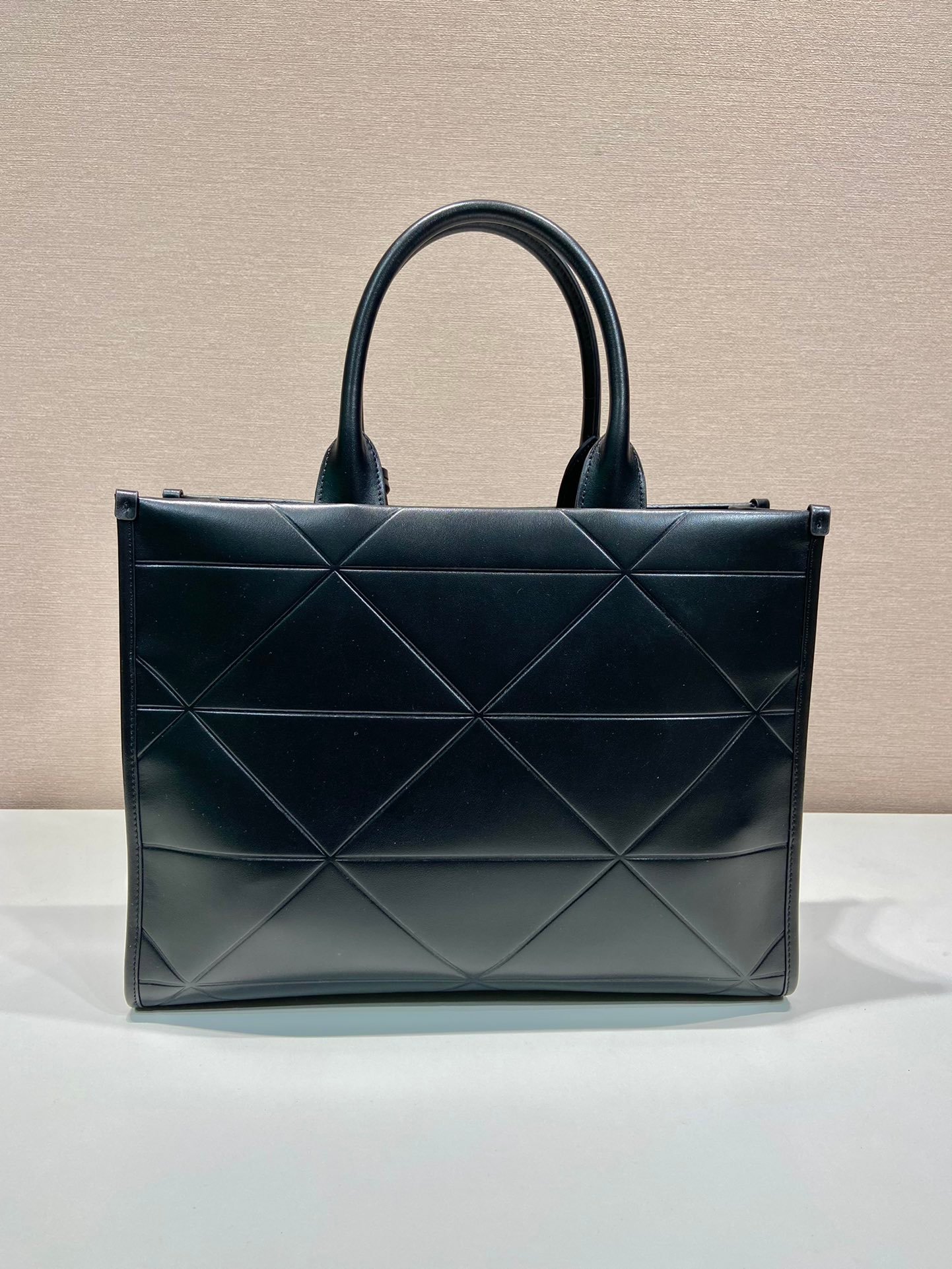 The soul of this handbag lies in its geometric complexity. Every stitch is a testament to Prada’s commitment to artisanal excellence. The “Symbole” quilting is not merely a pattern but a three-dimensional relief created through a meticulous hand-quilting process on premium imported calfskin. This leather is chosen for its supple texture and resilient finish, providing a soft touch while maintaining the bag’s architectural structure.