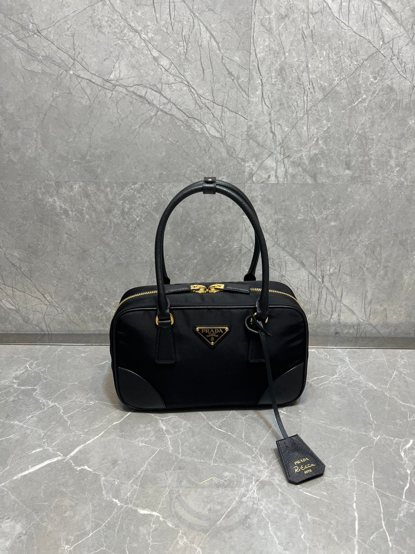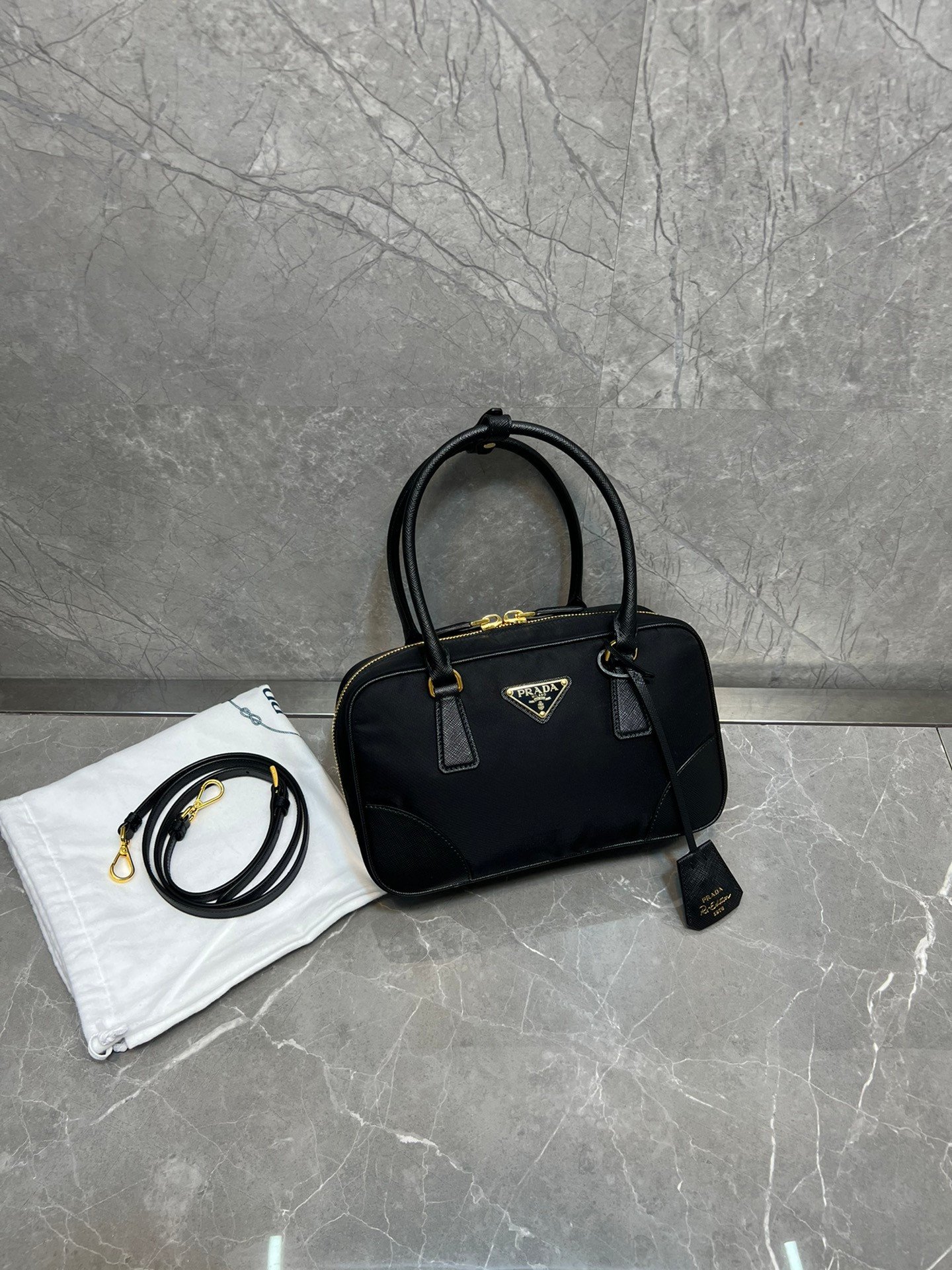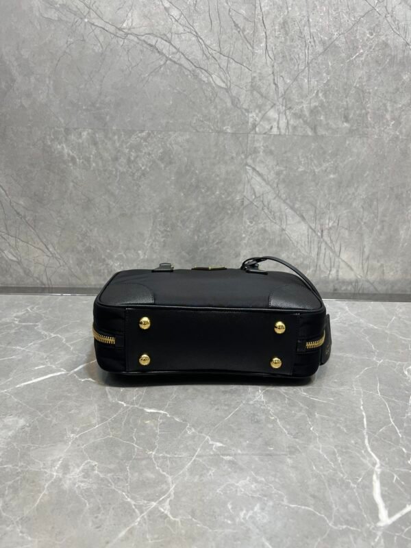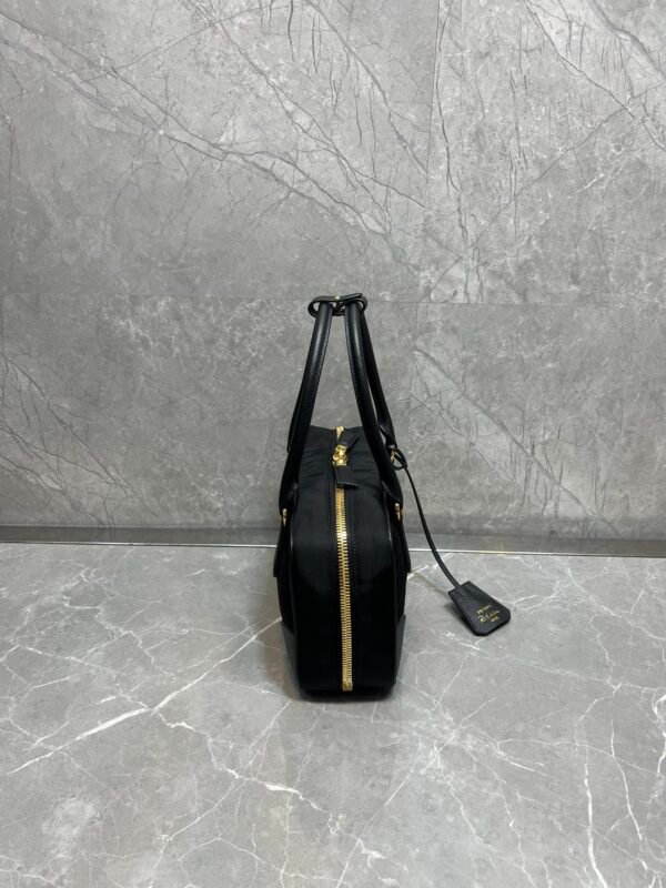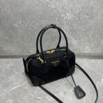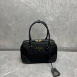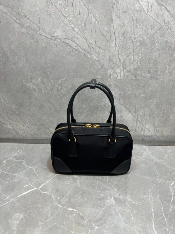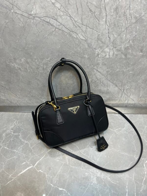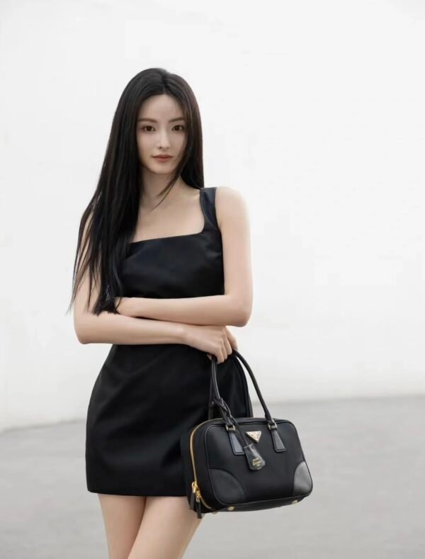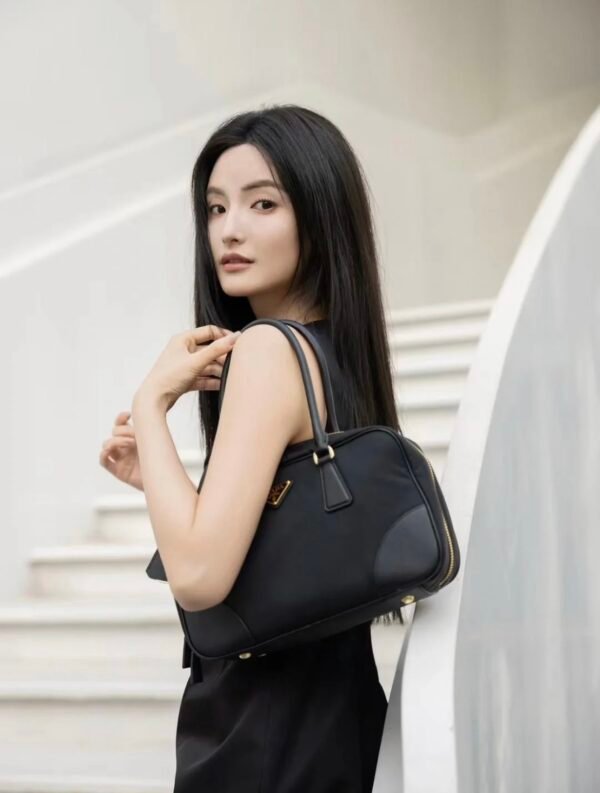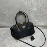Exquisite Craftsmanship & Materials This bag is meticulously crafted using Original-Grade Re-Nylon, Prada’s signature innovative fabric. This eco-conscious material is not only durable and water-resistant but also possesses a refined matte sheen that screams understated luxury. To elevate the structure, the bag features accents of Premium Italian Leather (sourced from elite tanneries). This specific leather trim provides a tactile contrast to the smooth nylon, ensuring the bag maintains its iconic “Bowling” shape even when fully packed.