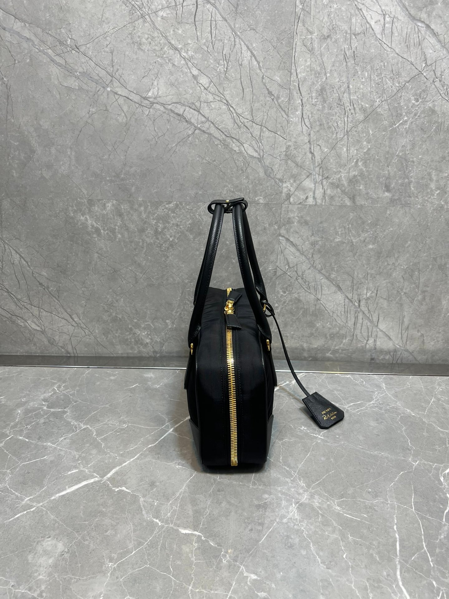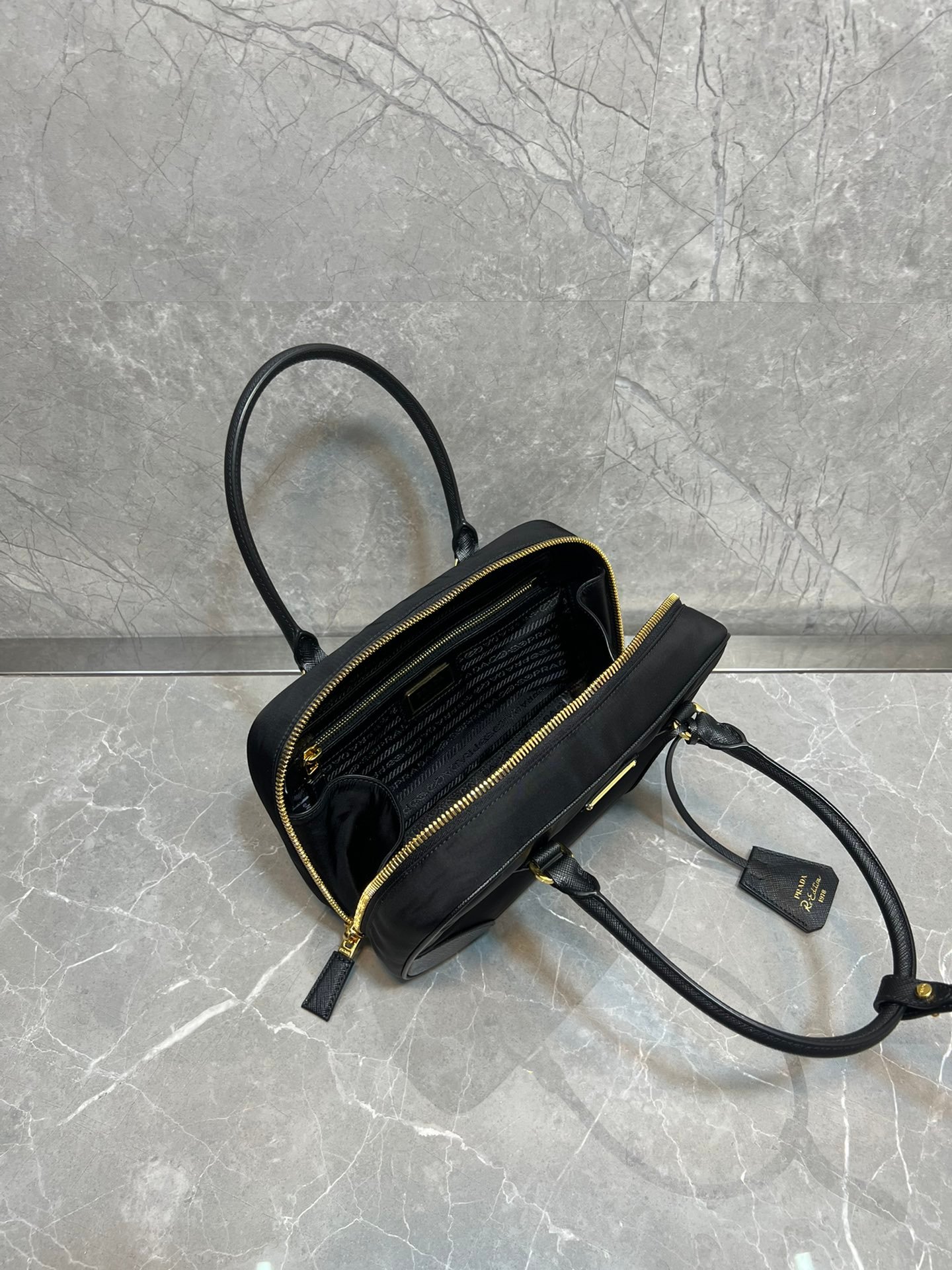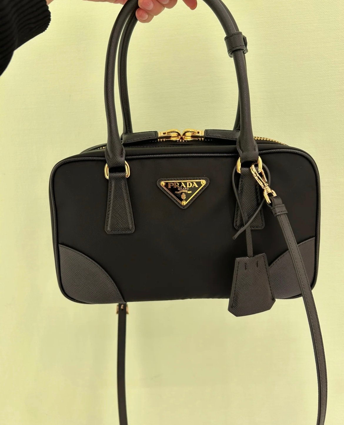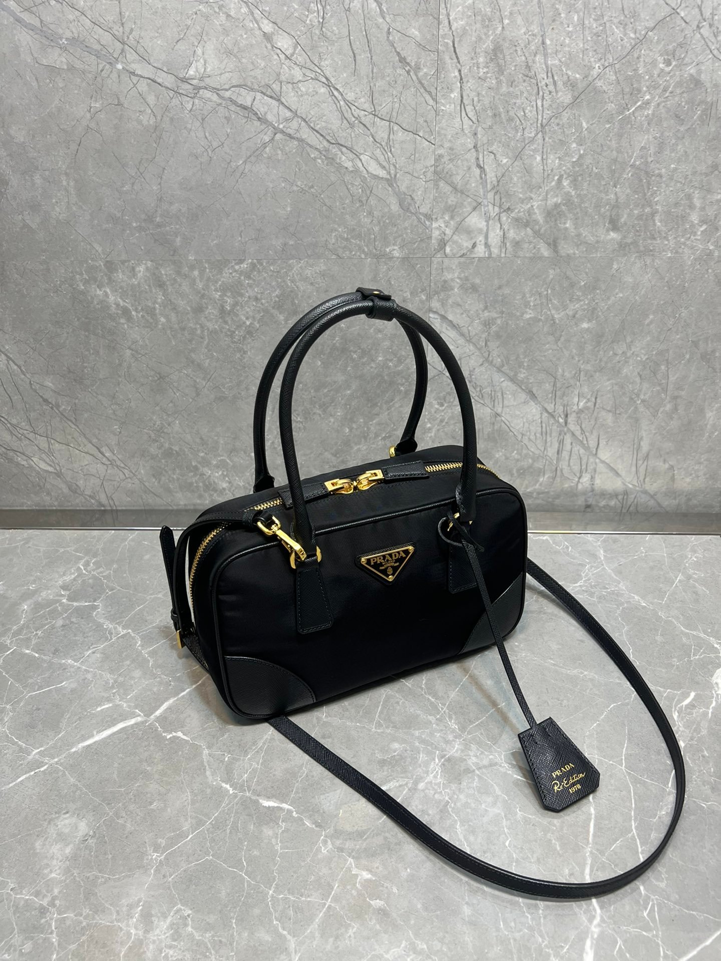 Exquisite Craftsmanship & Materials This bag is meticulously crafted using Original-Grade Re-Nylon, Prada’s signature innovative fabric. This eco-conscious material is not only durable and water-resistant but also possesses a refined matte sheen that screams understated luxury. To elevate the structure, the bag features accents of Premium Italian Leather (sourced from elite tanneries). This specific leather trim provides a tactile contrast to the smooth nylon, ensuring the bag maintains its iconic “Bowling” shape even when fully packed.