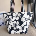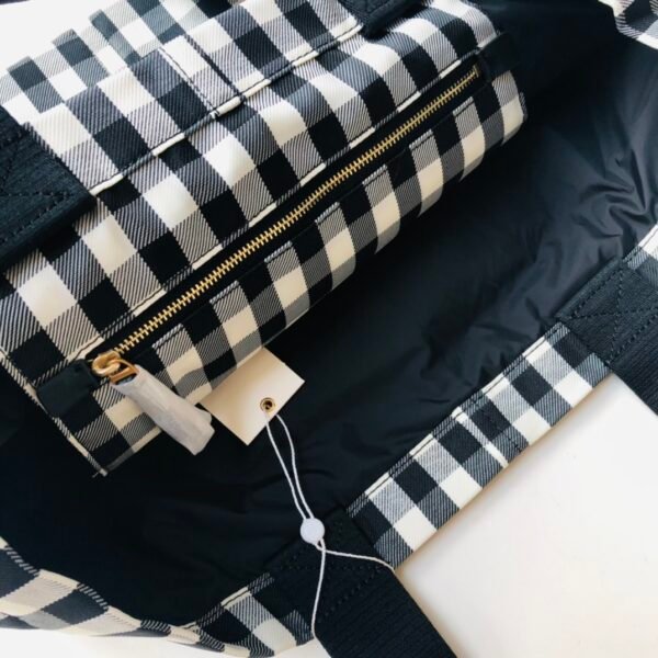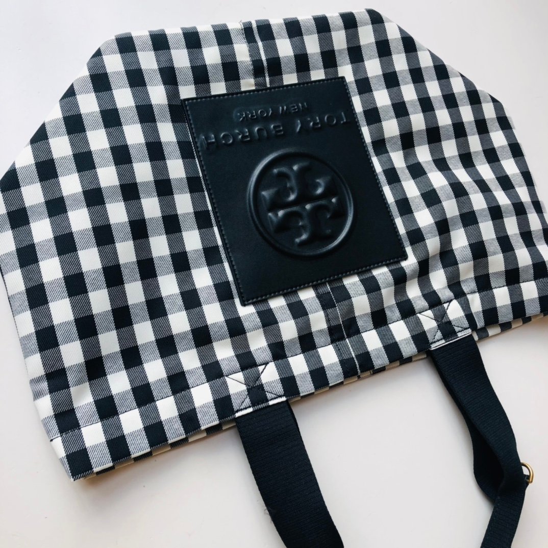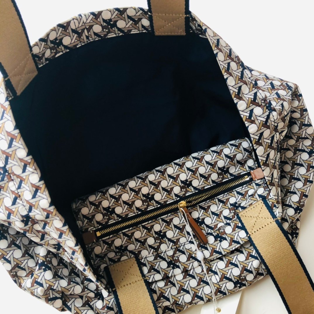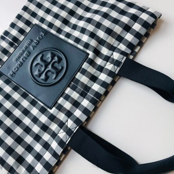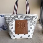 True to Tory Burch’s eclectic aesthetic, the bag showcases vibrant, contrasting prints—classic paisley, geometric weaves, or crisp gingham—paired with a prominent faux leather Double T logo patch. A unique feature of this model is its reversible design: with distinct prints on the front and back, and the ability to flip the bag inside out, you essentially get multiple looks in one accessory.