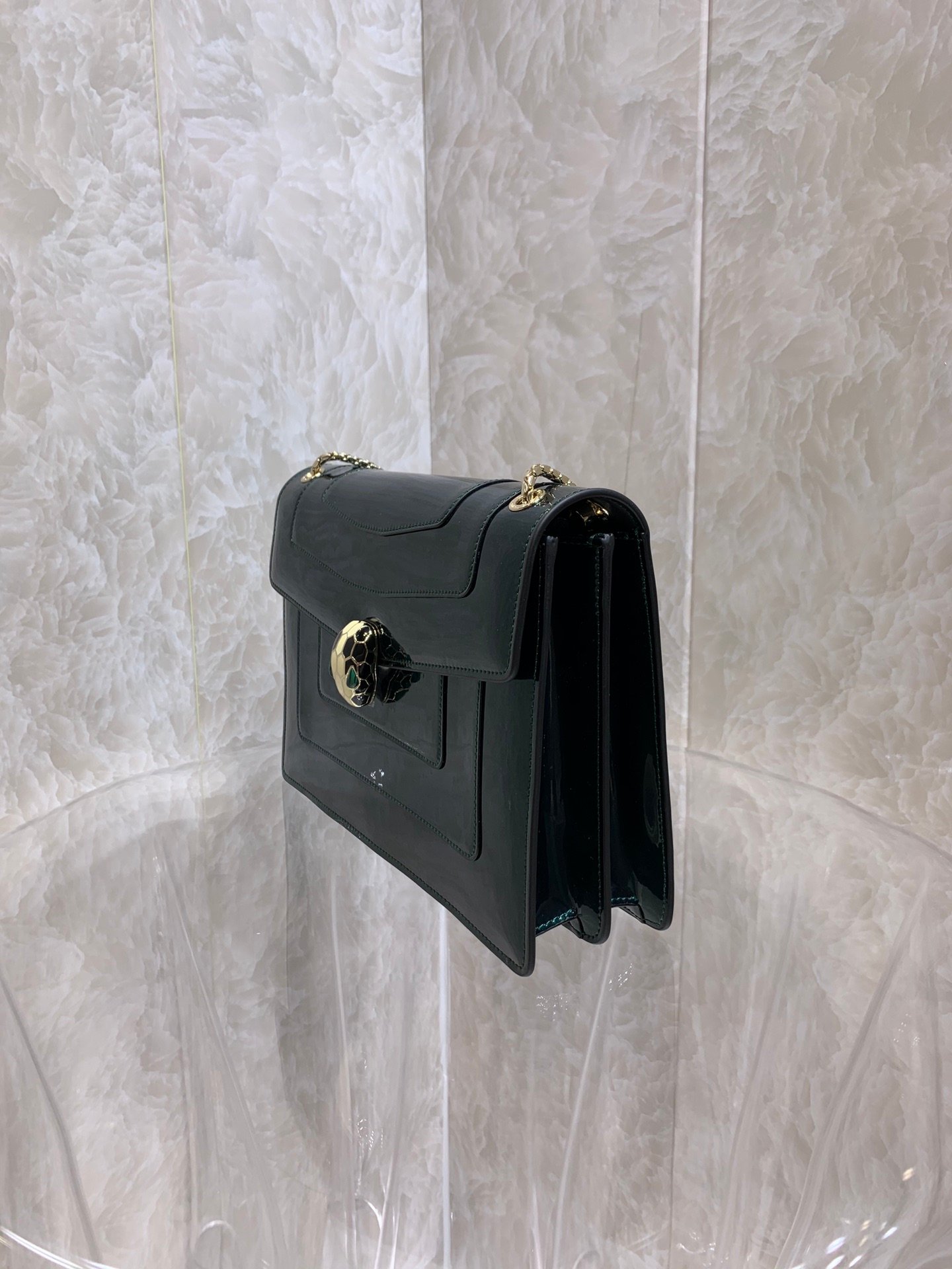 Hypnotic Details The bag is crowned by the iconic Snakehead closure, where scales of black and white enamel frame piercing green malachite eyes, acting as a talisman of wisdom and vitality. The sliding snake-body chain strap allows for versatile styling—wear it long as a chic shoulder bag or double it up for a shorter, evening look.