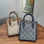 This adorable “Autumn/Winter New Arrival” redefines the classic tote with a trendy North/South (vertical) silhouette. The bag features the brand’s signature T Monogram pattern in a woven jacquard fabric, trimmed with fine leather handles and edges.
