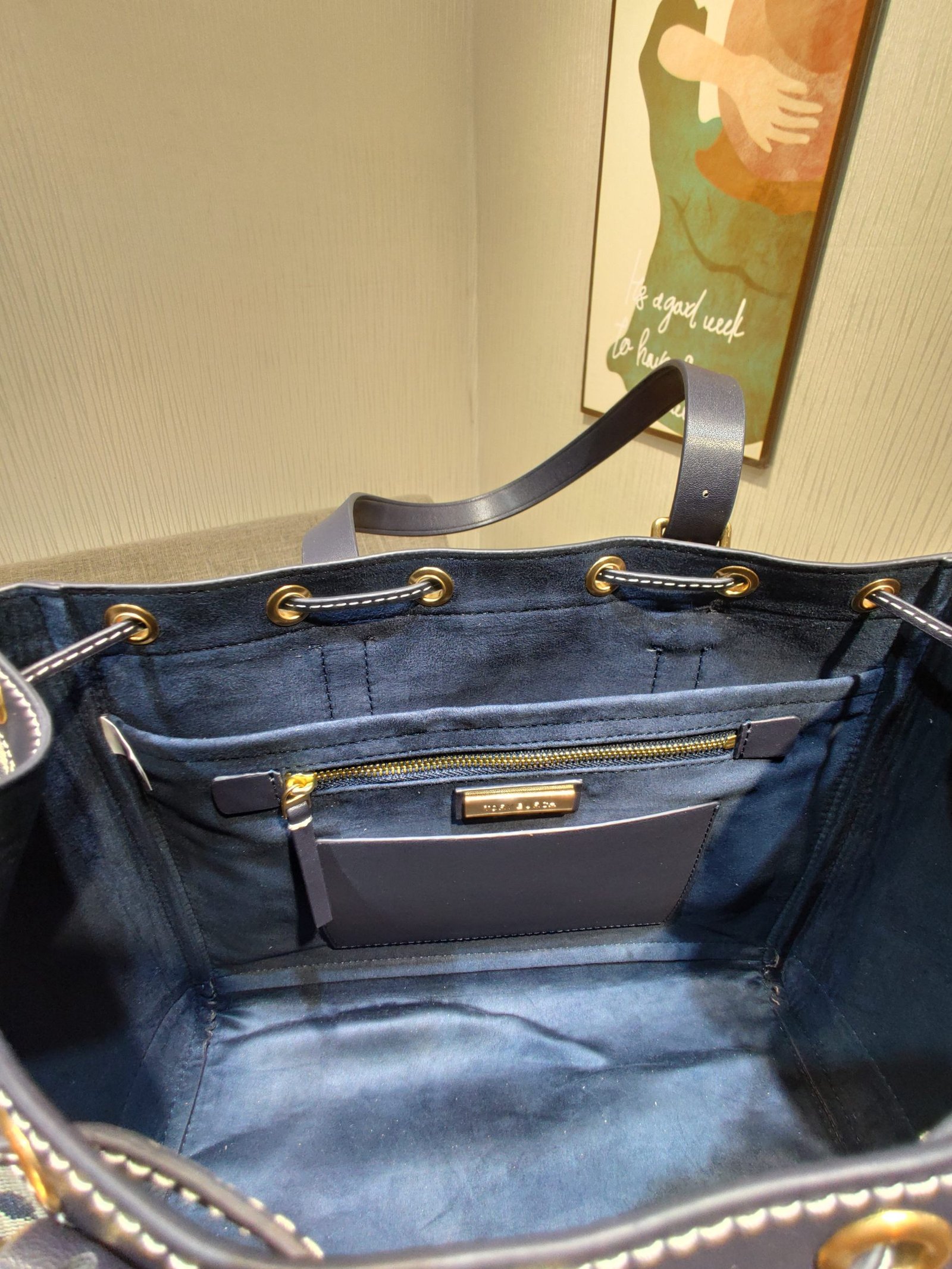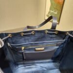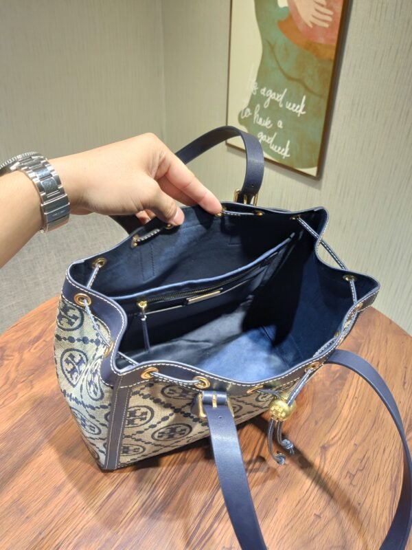 A distinctive feature of this model is the drawstring closure detailed with a gold-tone Double T toggle, adding both security and a jewelry-like accent to the bag’s front. The bag is framed by fine leather trim and features adjustable top handles with buckle accents, allowing for a customized fit whether carried by hand or on the arm.