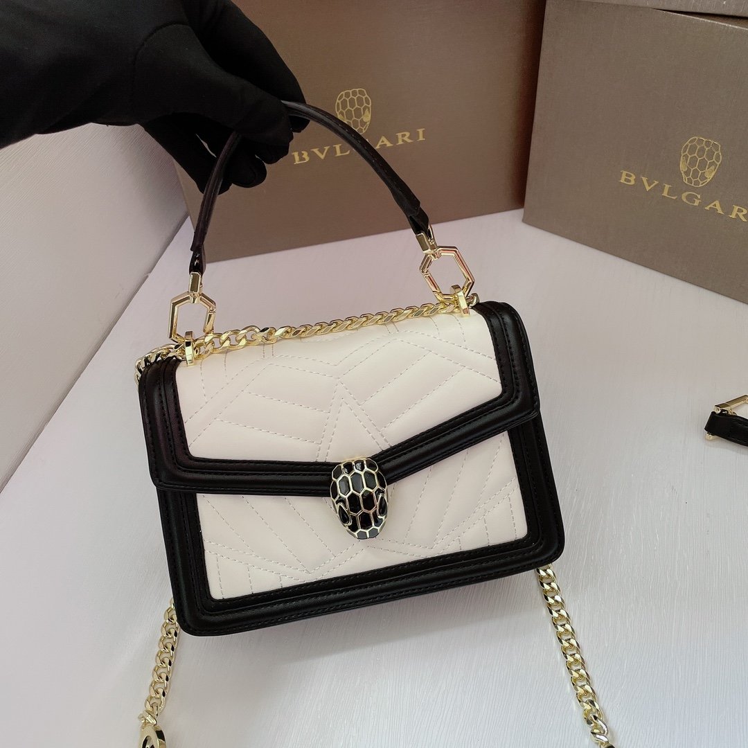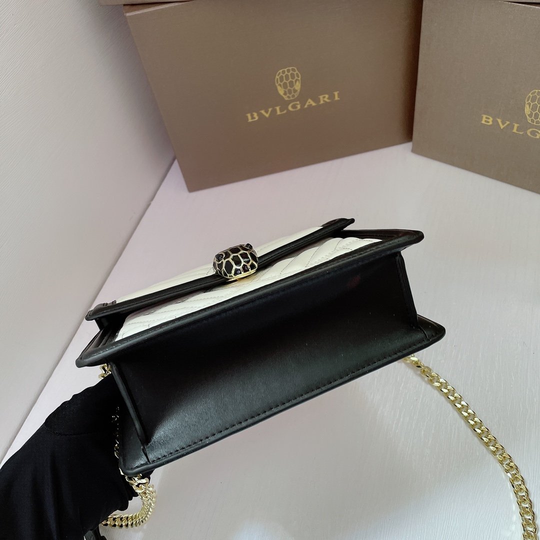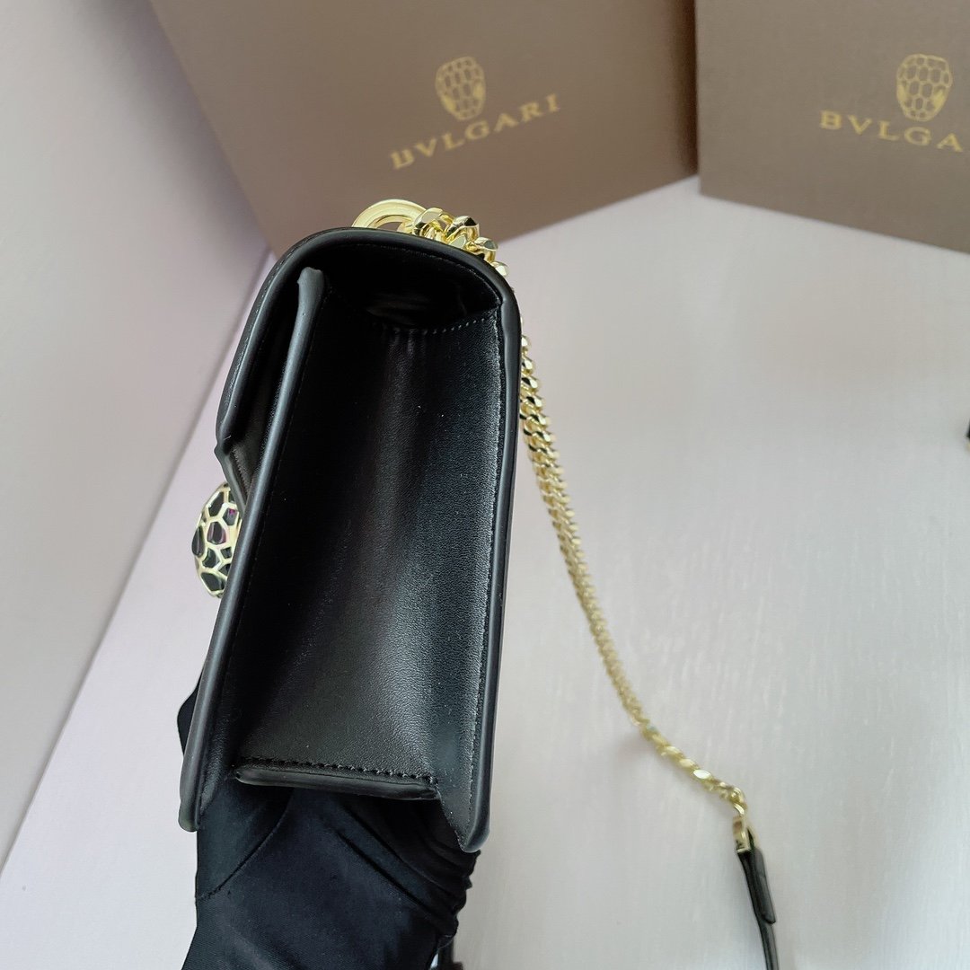 Iconic Details The front flap is secured by the legendary Snakehead closure, featuring matte black enamel scales and hypnotic black onyx eyes, acting as the jewel of the bag. The compact 20cm interior is perfectly sized for essentials, complete with a Bvlgari metal logo on the back and a personalized mirror inside.