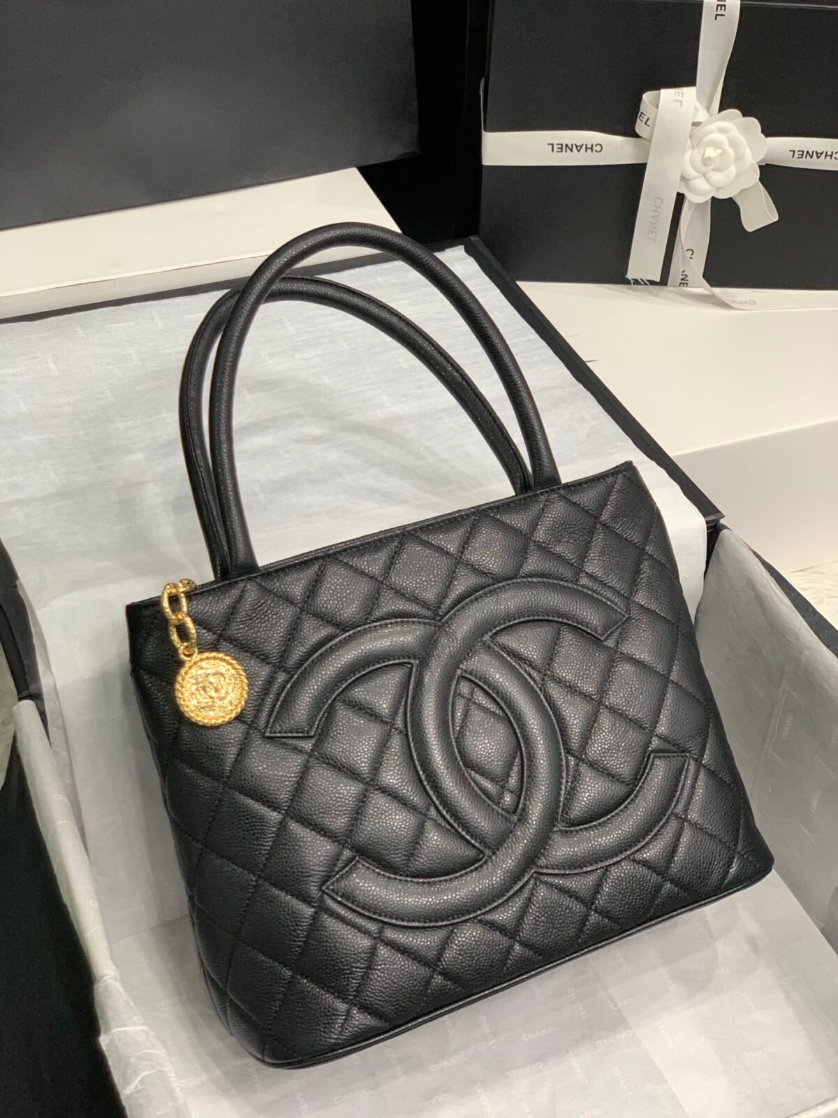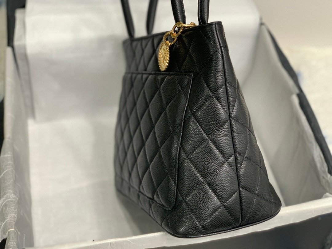 This exclusive 2022 “Supreme Version” recreates the legend with original imported Caviar calfskin, offering that signature pebbled “fish caviar” texture that is incredibly durable and scratch-resistant. The structured body features the oversized CC logo stitched onto the front and is crowned with the iconic gold medallion zipper pull.