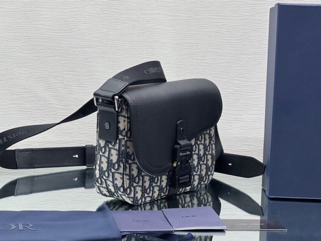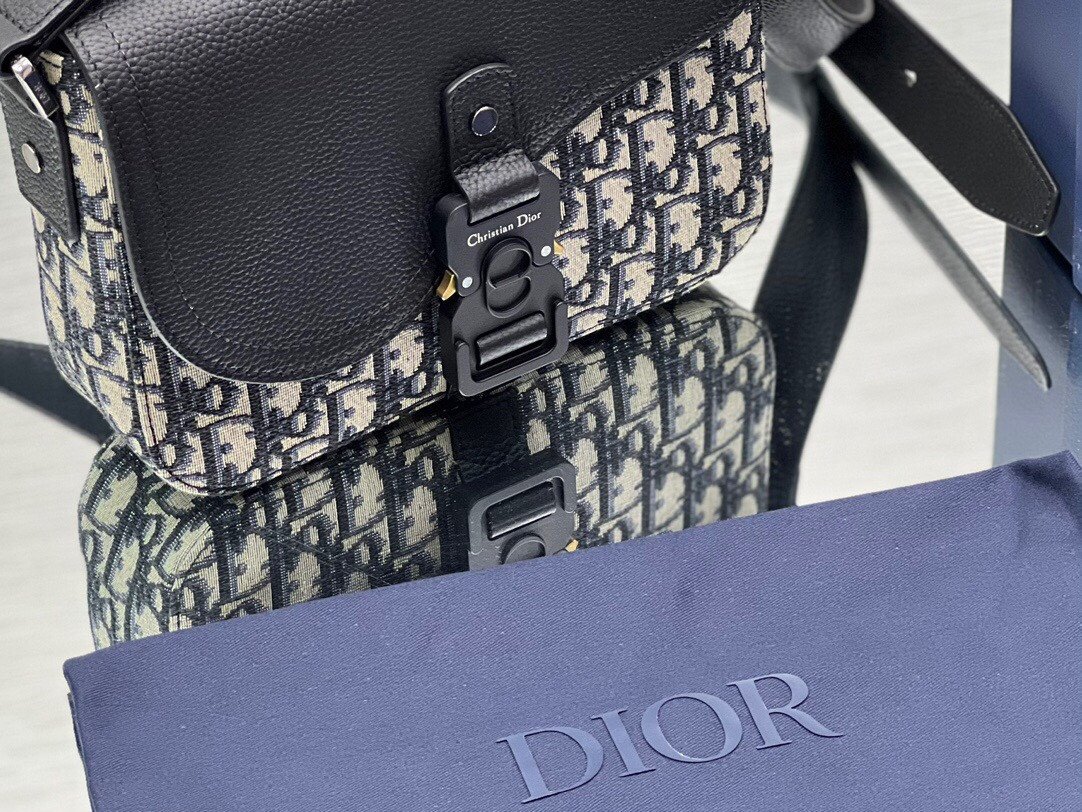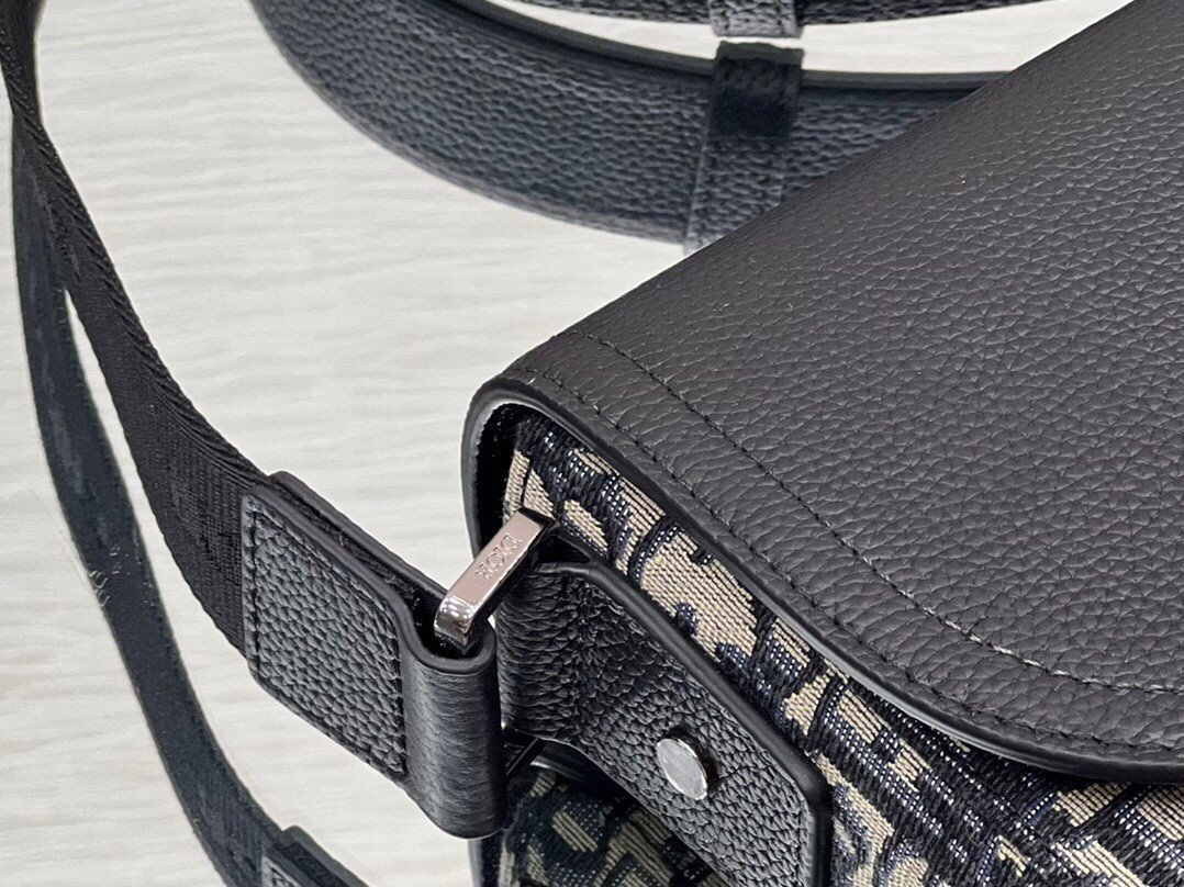 This bag features the House’s signature Beige and Black Oblique Jacquard, contrasted by a sophisticated black grained calfskin flap. The flap is cut in the iconic Saddle silhouette, highlighted by an industrial-style aluminum buckle adorned with the “Christian Dior” signature and “CD” initials.