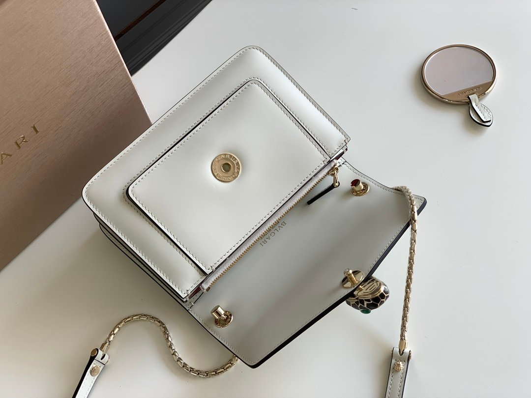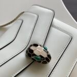 Jewelry-Inspired Heritage The front flap is secured by the mesmerizing Snakehead closure, a hallmark of the house. Finished in light gold, the clasp features scales of black and white enamel and is set with hypnotic green malachite eyes that capture the gaze.