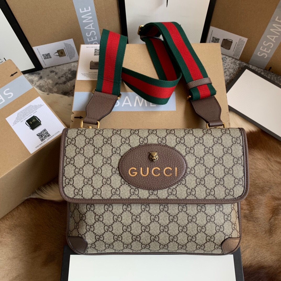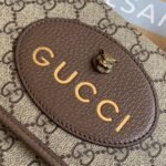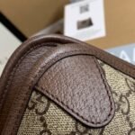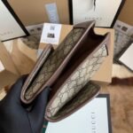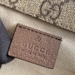This bag is crafted from the House’s classic GG Supreme canvas (PVC), beautifully framed by rich brown cowhide leather trim. The front flap is punctuated by a signature oval leather tag featuring a striking metal feline head and the “GUCCI” logo in gold lettering.