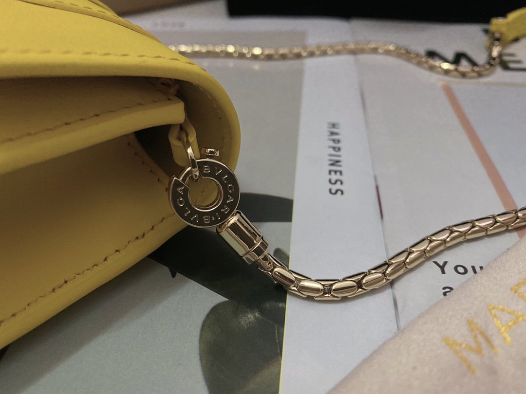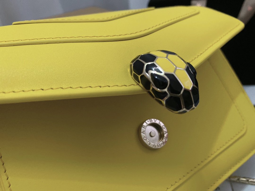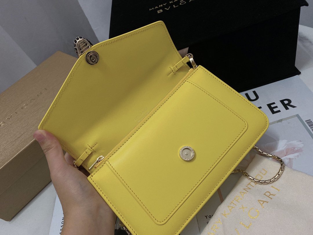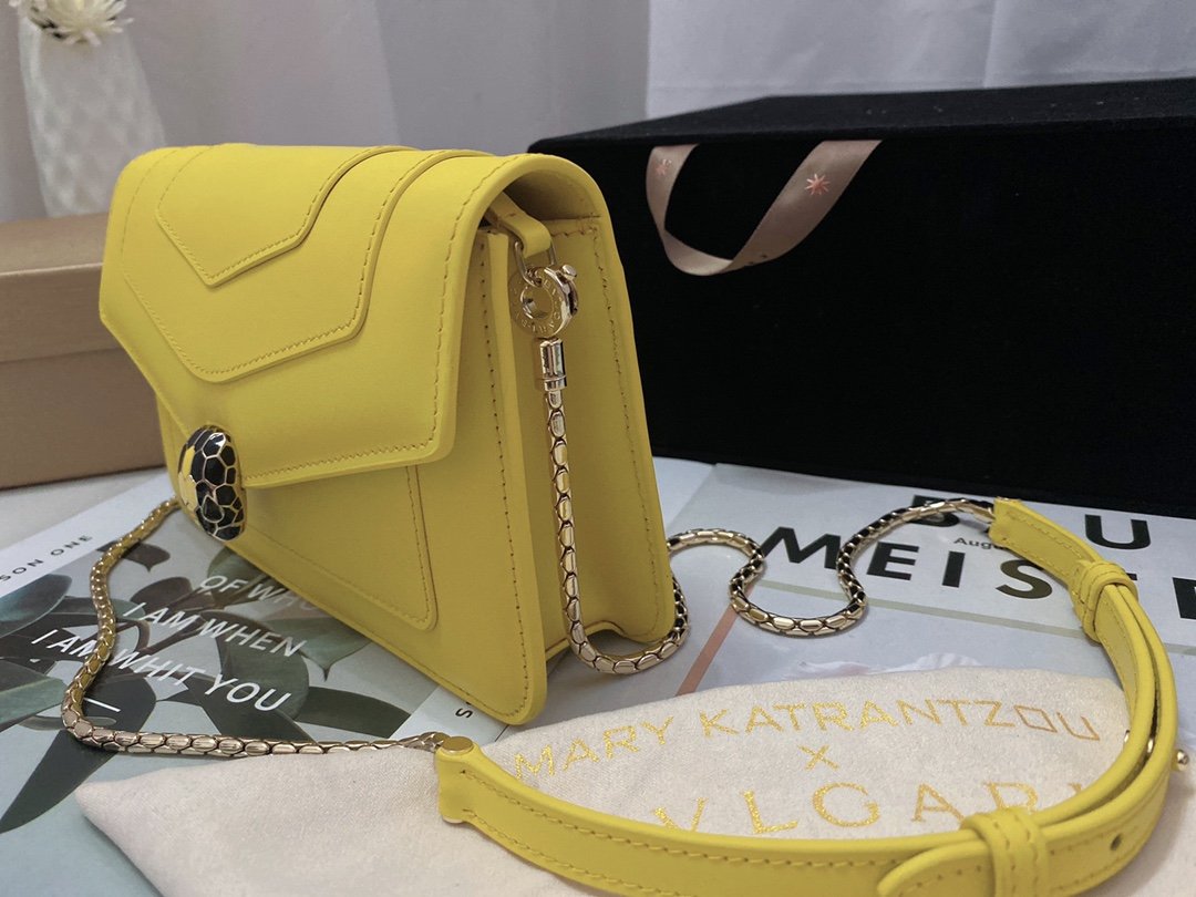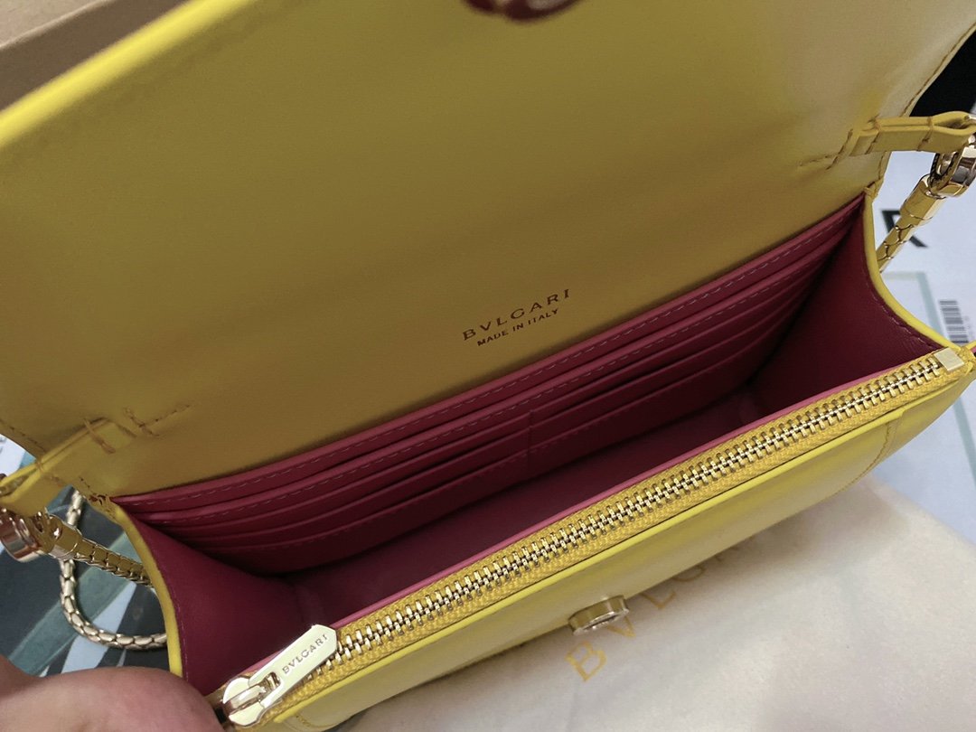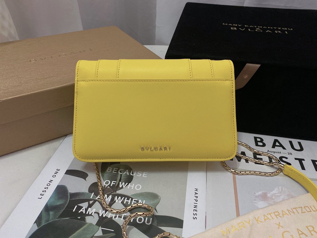 A Ray of Roman Sunshine Infuse your wardrobe with the vibrant energy of the Bvlgari Serpenti Forever Chain Wallet. Crafted from smooth Daisy Topaz calfskin, this bag is a celebration of color and light. The front flap is crowned by the iconic Snakehead closure, mesmerizingly finished with tone-on-tone matte and shiny enamel scales and piercing black onyx eyes, acting as a jewel that guards your essentials.